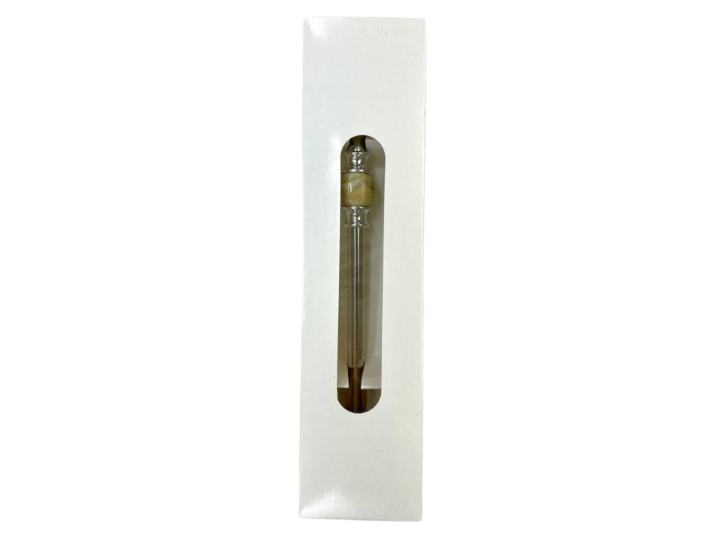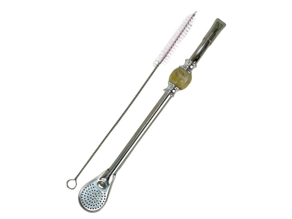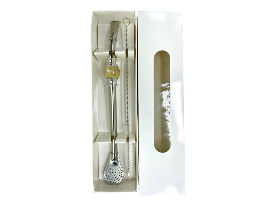 Bombilla with a beige stone, 22 cm in length, made of stainless steel + cleaning brush in a box.