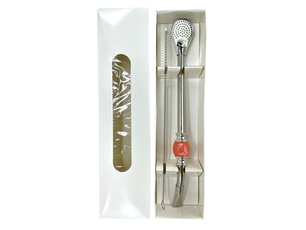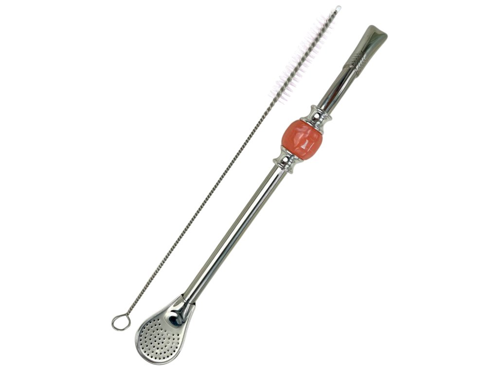 Bombilla with a pink stone, 22 cm in length, made of stainless steel + cleaning brush in a box.