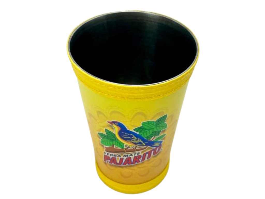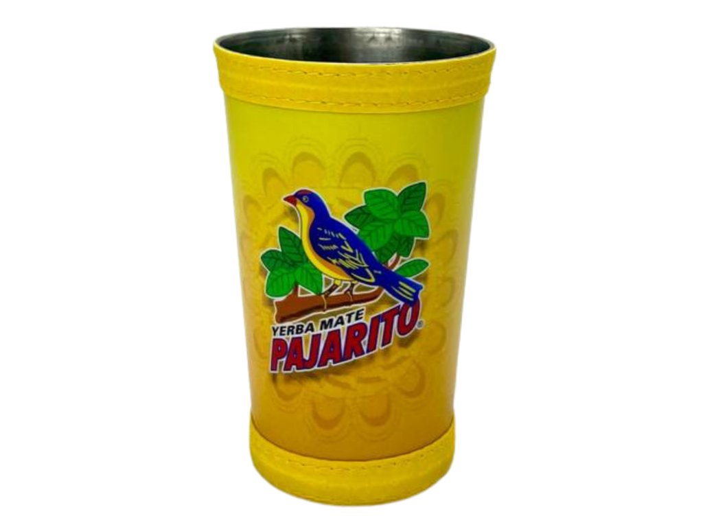 Thin metal container covered with leather, with the Pajarito logo in yellow. Intended for drinking Yerba Mate in the form of tereré (cold). Material: Stainless steel, eco-leather. Volume: 200 ml. Country of origin: Paraguay.Additional parameters