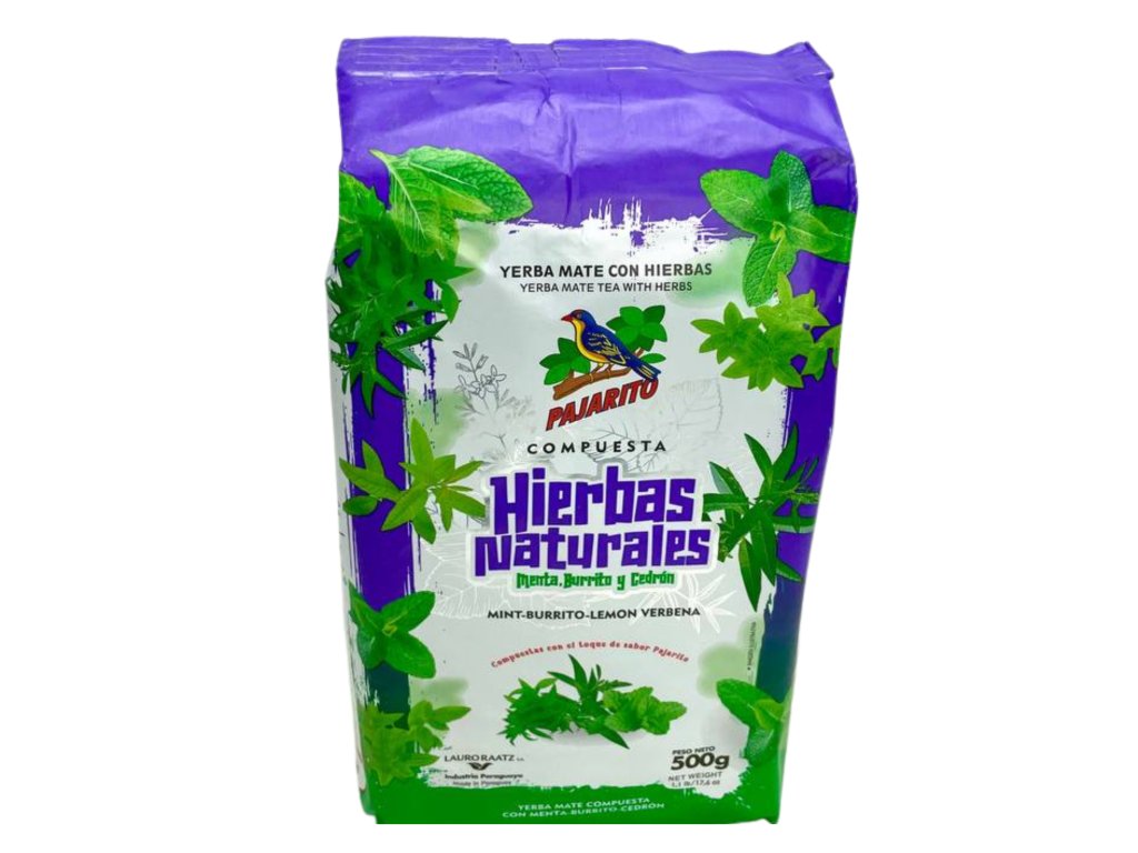 Pajarito Compuesta Hierbas is an herbal blend of yerba mate. It consists of 90% yerba mate and 10% aromatic herbs. The mix of mint, cedron, and burrito brings an invigorating, aromatic taste. Weight: 500g Country of Origin: ParaguayAdditional parameters