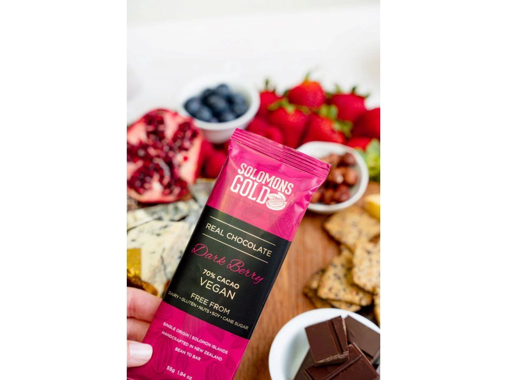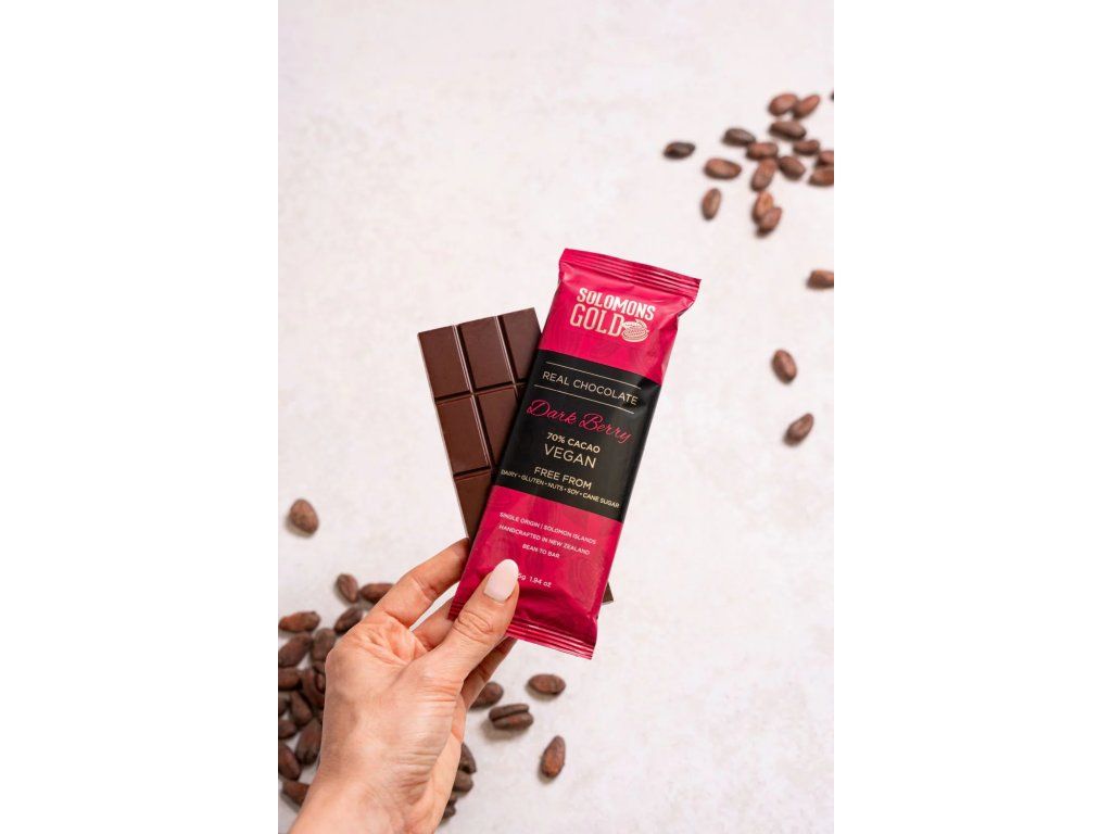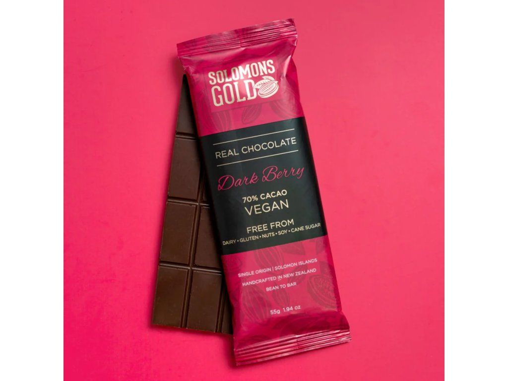 Solomons Gold Smooth Dark Berry 70% is a premium bean-to-bar chocolate crafted from single-origin cacao grown in the Solomon Islands. This bar pairs rich 70% dark chocolate with vibrant natural fruit notes, creating a balanced flavour profile that is both deep and refreshing. Sweetened only with organic coconut sugar and free from common allergens, it offers a clean, bright, and naturally sweet taste experience.Additional parameters